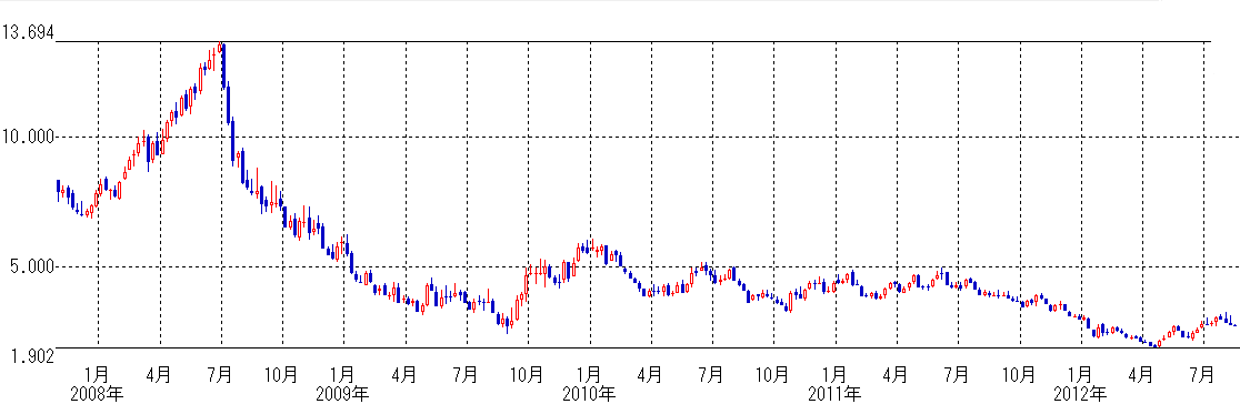 夏以降、急激に下がり、2009年1月に32ドルまで達しました。その後は、もみあいながらも上昇を