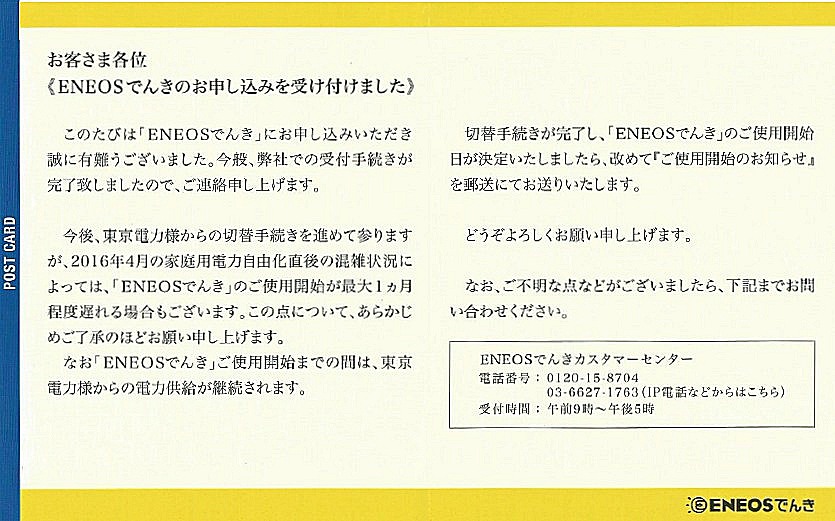 ENEOSでんきに申込まれたお客様 受付はがき1 同ハガキ2 は届きましたか