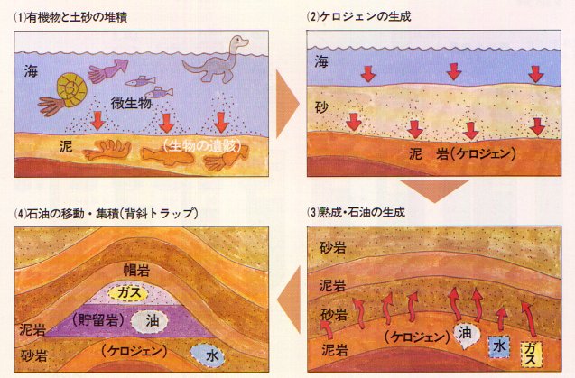 岩石となる途上に有機物が複雑に重合して「ケロジェン」となり、地熱や圧力の影響を受けて