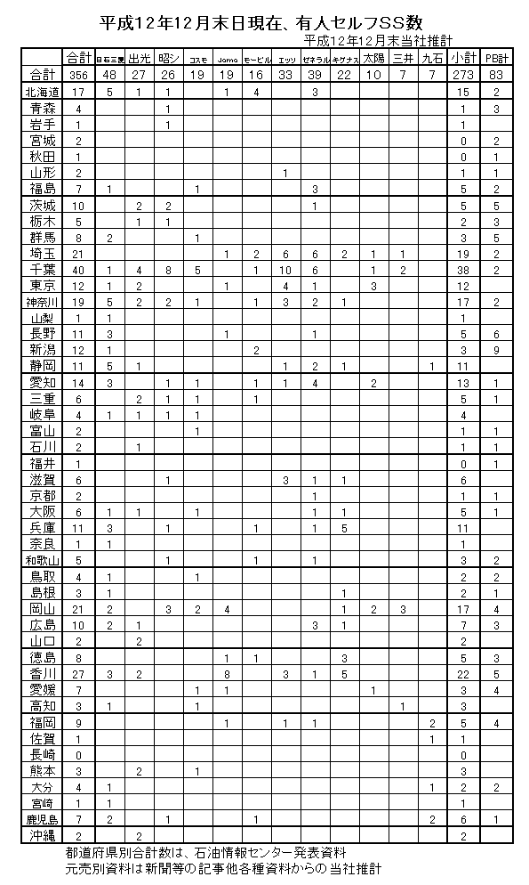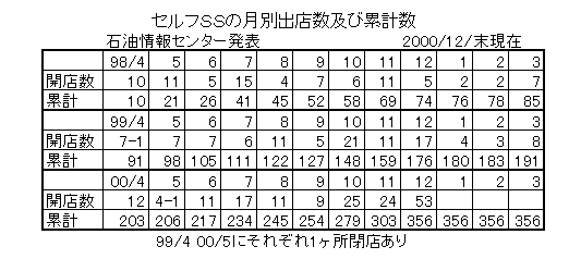セルフSSの月別開店数と累計数(98/4-00/12)とセルフの形態